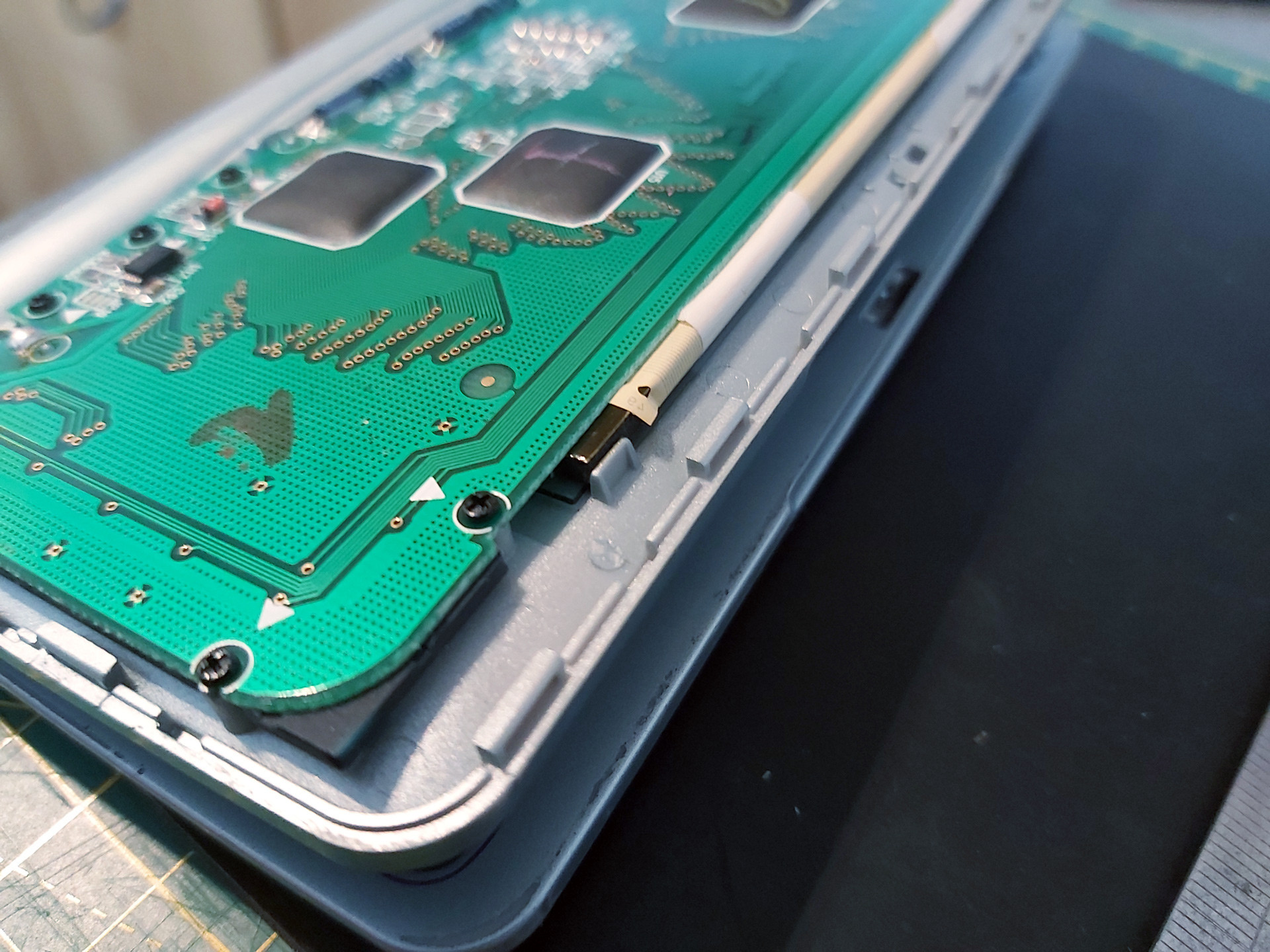 This is the Sharp IQ-8920. Its screen is still 240 pixels wide, like the IQ-8000, but it is significantly taller and has square pixels. When I first saw one of these online I was less interested in it as it didn't have the obvious card slot, but when I looked at a closer photo of it I could see that it still had one on the side. I couldn't see how this would work, as it's missing the window to see the card's buttons through, but I ended up picking one up anyway. It turns out it is still backwards-compatible with the cards from the earlier organisers, and this backwards-compatibility is achieved by displaying the card's buttons directly on the resistive touchscreen (I assume there's a database of cards and their button assignments somewhere in the IQ-8920's ROM). The IQ-8920 also corrects one notable oversight of the IQ-8000…